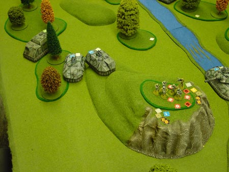 A view of the scene as the second FSE cargo truck (to the left of the picture) attempts to move around the battle, while the sole remaining member of the NI HAMR squad puts up a spirited defense of his position.