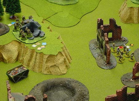 Two Gurkha sections behind cover on a hill, overlooking Saeed Khalifate mercenary troops taking cover in a ruined building.