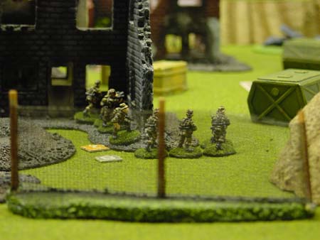 Gurkha rifle section advances through a ruined building.