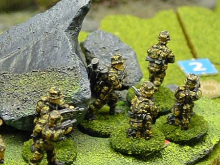 Close-up of members of a Gurkha rifle section and the weapons section advancing through cover. Trooper carrying the NAC GMS/P on his back is a "custom" figure (created simply by gluing a standard NAC GMS/P to his back - the simplest of conversions).